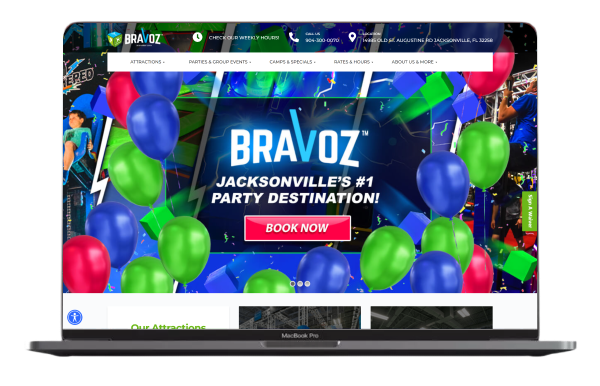 Bravoz Entertainment Center is a trampoline park and arcade based in Jacksonville, Florida. The company approached us for help with their rebranding efforts, which included everything from creating a new logo and color scheme to designing and developing a new website. Recently, Bravoz had separated from Rebounderz, their previous franchise. As a result, they needed to create a new website that would accurately reflect their brand identity and appeal to their target market. According to their separation agreement, Bravoz had a limited time-frame to launch their new brand and website before their Franchise listing page would be shut off. Additionally, Bravoz had a go to transition from their previous target audience of primarily children 9-14 years old to a wider audience that included more adults and families.